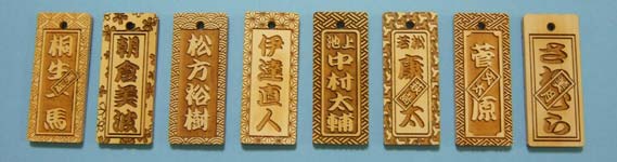 名入れストラップやお守りに木札はいかがでしょうか。名入れに限らずお好きな文字が彫刻できます。家紋等についてもご相談ください。使い道は色々。大小様々な木札がございますので、是非、ご来店の上、お選びください。